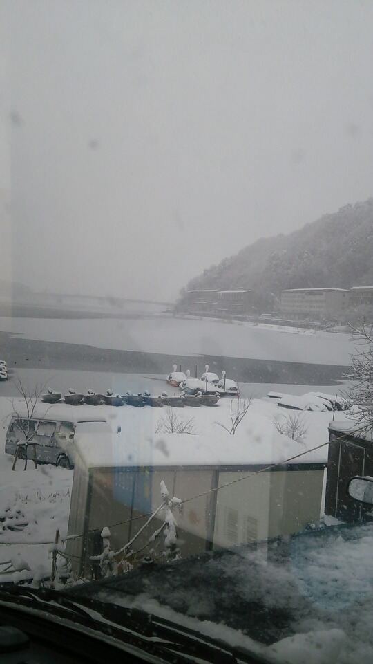 河口湖は、湖も白くなってました。